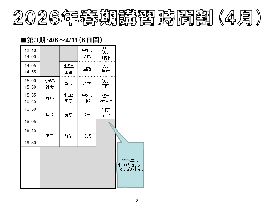 前学年までの総復習を目指し、講習用の専用テキスト1冊を仕上げます。